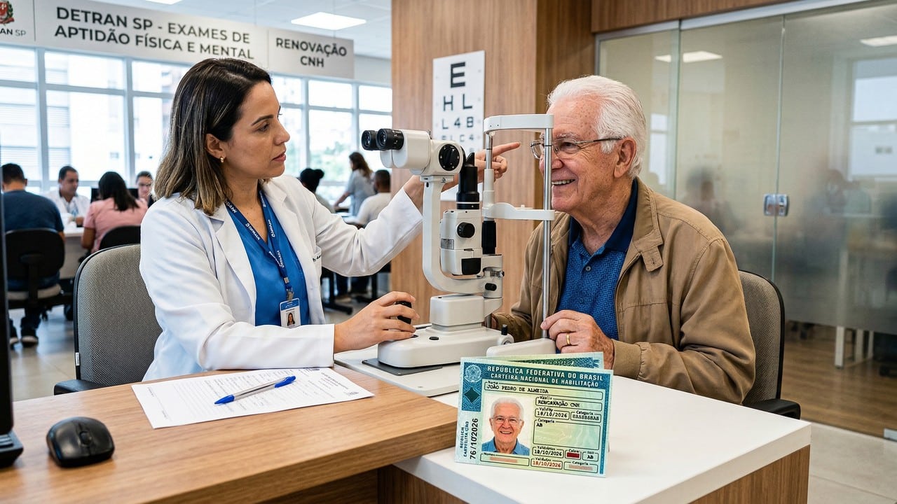 Na rotina dos Detrans, a renovação da CNH para idosos não inclui, automaticamente, um novo exame prático de direção. O procedimento padrão concentra-se no exame médico, obrigatório para todos os condutores, com foco em visão, reflexos e capacidade cognitiva.