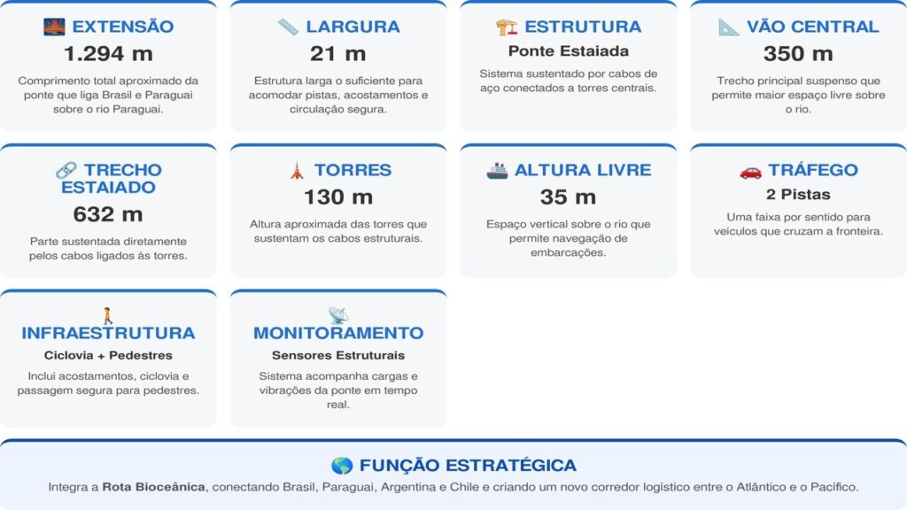 Com previsão de entrega para agosto deste ano, a ponte permitirá o fluxo direto de veículos e mercadorias entre os dois países, sendo considerada um dos marcos mais importantes da rota bioceânica. Veja abaixo as características da ponte: