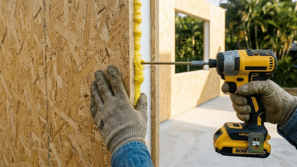 A montagem de um kit SIP é intuitiva e funciona como um grande quebra-cabeça estrutural. Após a preparação da fundação, que normalmente é um radier de concreto devidamente nivelado, instala-se uma cinta de madeira ou um perfil metálico ancorado para servir de guia aos painéis verticais. A vedação entre as juntas é realizada com espuma de poliuretano (PU) expansiva, garantindo total estanqueidade contra a entrada de ar e umidade.