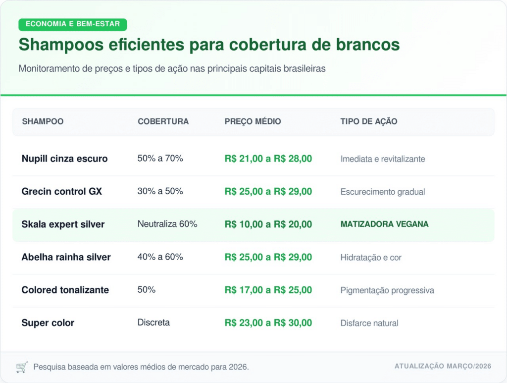 O shampoo de farmácia tornou-se a solução número um para quem busca praticidade ao esconder os primeiros fios grisalhos sem gastar com salão. Em 2026, opções como Nupill e Skala oferecem cobertura de até 70% por menos de R$ 30,00.