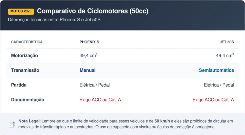A montadora oferece opções variadas para atender perfis distintos de condutores urbanos. Enquanto a Phoenix S foca na agilidade clássica, a Jet 50S traz uma proposta com transmissão semiautomática. Ambas compartilham a vantagem de não exigir a categoria A da Carteira Nacional de Habilitação (CNH).