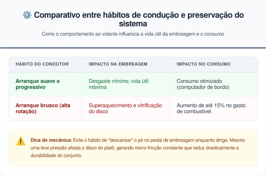 O arranque violento é o maior inimigo do sistema de transmissão. Motoristas que “queimam” a embreagem para ganhar agilidade no semáforo antecipam a troca de um kit que deveria durar mais de 80 mil quilômetros. O estresse térmico derrete o material de fricção do disco, reduzindo sua eficiência.