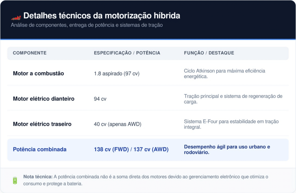 O conjunto mecânico do Toyota Corolla 2025 japonês foi projetado para equilibrar silêncio e performance. O sistema principal utiliza um motor 1.8 de ciclo Atkinson trabalhando em conjunto com motores elétricos de alta eficiência. Nas variantes com tração integral (E-Four), um motor adicional no eixo traseiro garante estabilidade extra em pisos escorregadios.