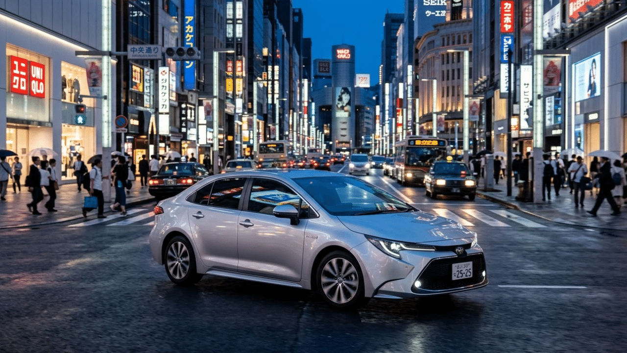 Toyota Corolla 2025 híbrido desfila pelas ruas modernas de Tóquio