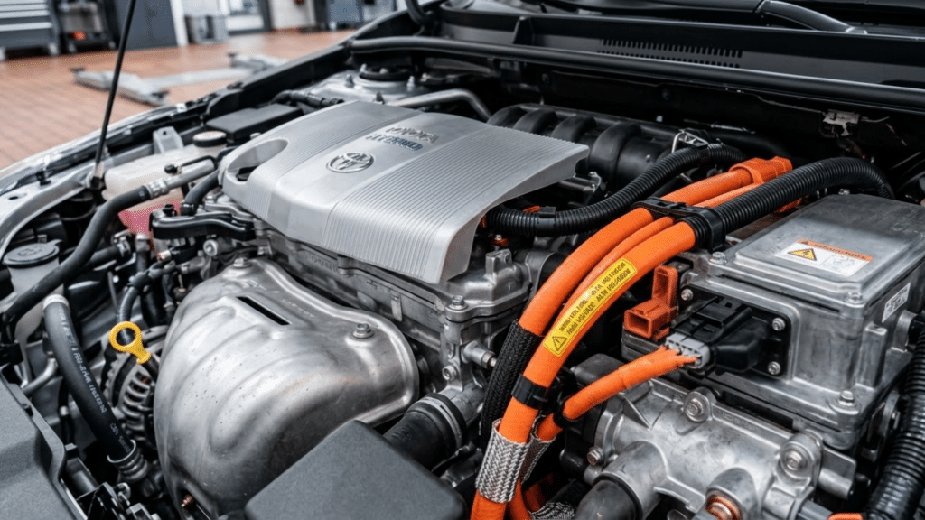 Detalhe técnico do motor híbrido 1.8 e cabos de alta voltagem