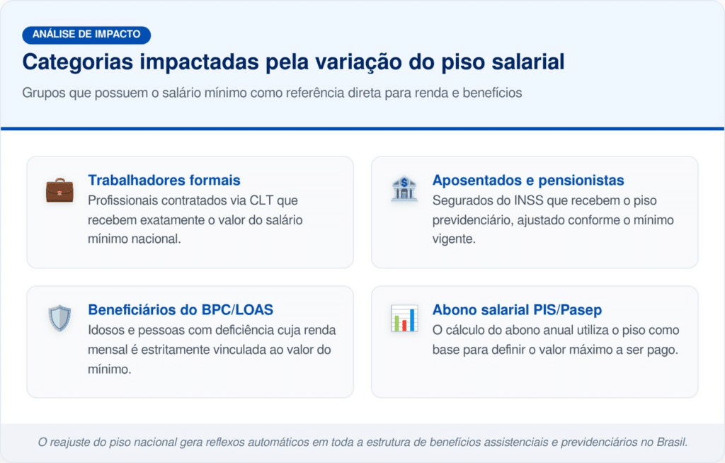 O novo piso nacional alcança um público amplo, formado por trabalhadores, aposentados e beneficiários de programas sociais. Milhões de pessoas têm rendimentos vinculados ao salário mínimo, o que torna o reajuste um tema socialmente sensível.