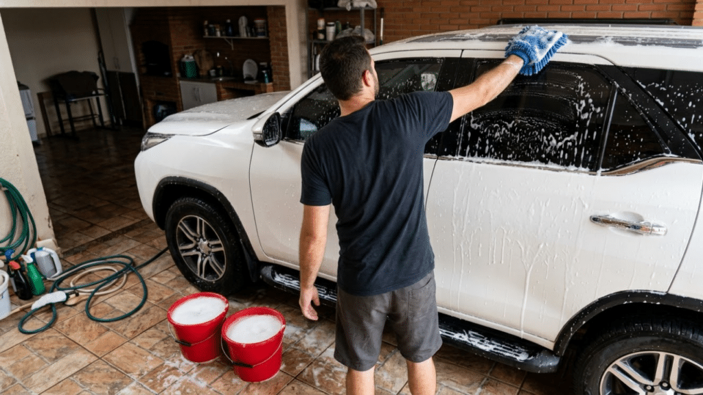 Lavar o carro sob sol forte é um erro estratégico que força novos enxágues. O calor faz a água evaporar rapidamente, secando o sabão na pintura e criando manchas que exigem um retrabalho desnecessário e mais gasto hídrico.