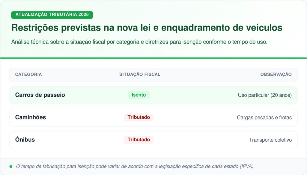 As exceções contidas no texto da Emenda Constitucional são claras e visam manter o equilíbrio da arrecadação estadual. Para visualizar as categorias que não têm direito à isenção de IPVA por tempo de uso, analise o quadro comparativo abaixo: