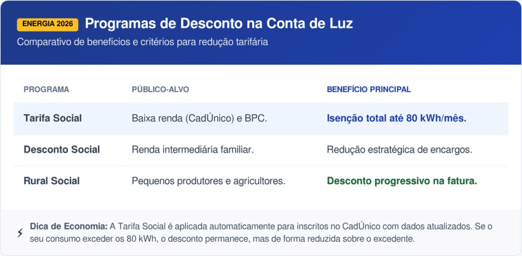 Em 2026, a regulamentação separou a gratuidade total de um novo incentivo voltado para famílias com renda ligeiramente superior. Enquanto a Tarifa Social de Energia foca na isenção plena para o consumo básico, o chamado Desconto Social atua reduzindo encargos setoriais para faixas intermediárias.