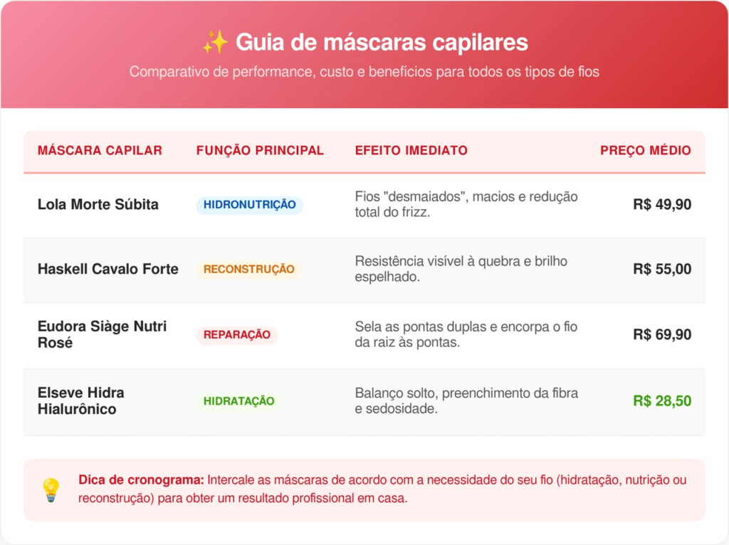 Ao investir em produtos com ativos como aminoácidos e óleos vegetais, você garante uma reposição de massa eficaz. O custo-benefício se torna evidente quando comparamos o valor de um pote de R$ 28 com uma sessão completa de hidratação profissional.
