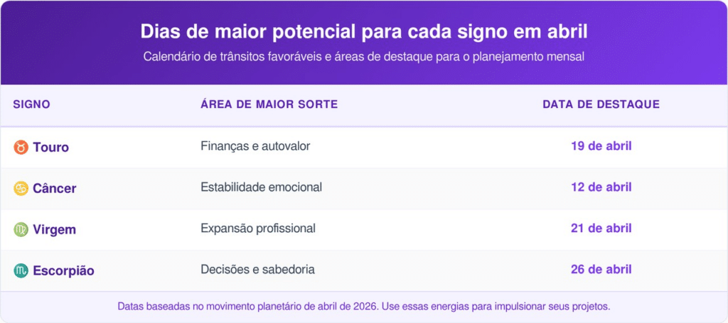 Veja a tabela com os dias de maior potencial para cada signo em abril: