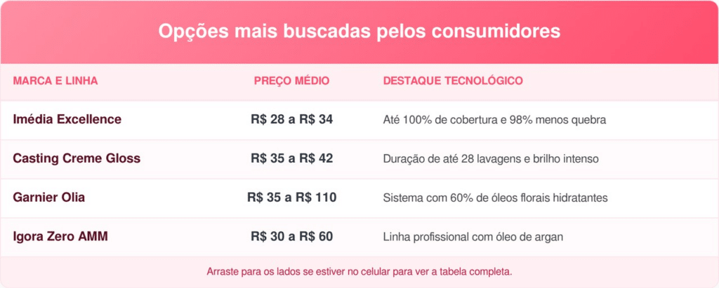O mercado brasileiro oferece alternativas para diversas necessidades, desde reflexos suaves até a cobertura profissional de fios brancos. As linhas variam conforme o tempo de duração da cor e a tecnologia de tratamento integrada na bisnaga de coloração.