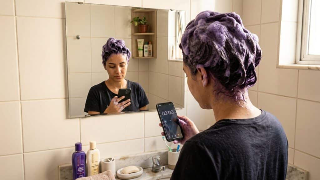 Respeite o tempo de pausa indicado na embalagem, que costuma variar de 3 a 5 minutos. Exceder esse tempo com matizadores violetas pode deixar os fios com reflexos azulados ou roxos. Finalize sempre com um bom condicionador para selar as cutículas e preservar o pigmento depositado.