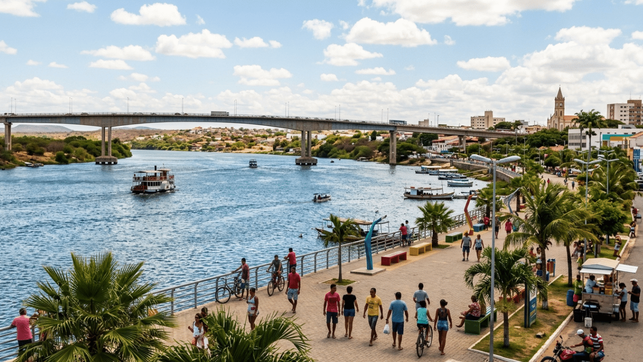 - Orla de Petrolina: calçadão à beira do rio com ciclovia, quiosques e vista direta para Juazeiro, no outro lado da margem.