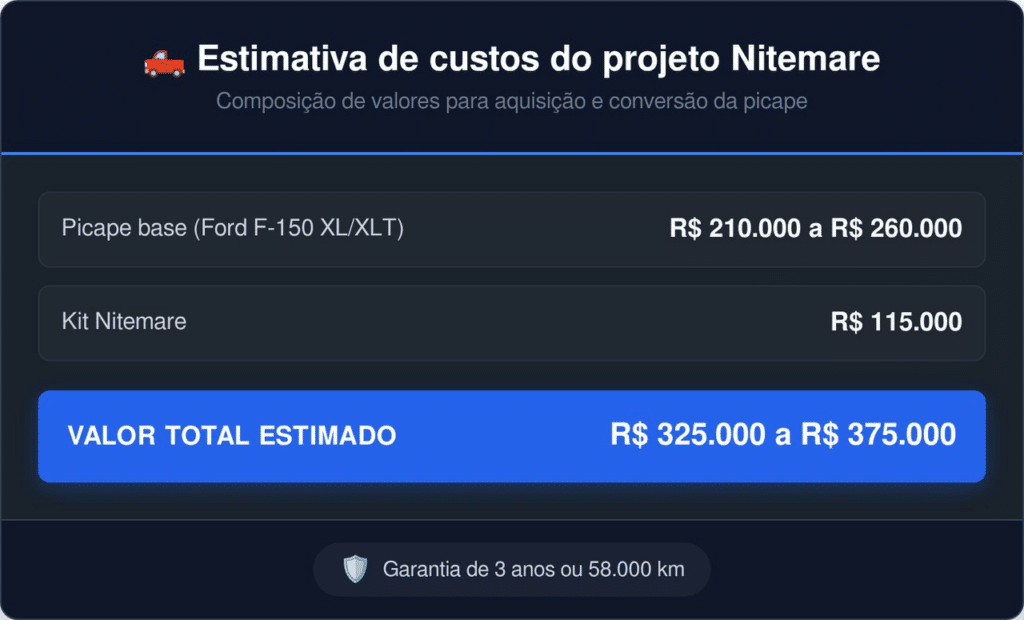 O investimento para esse tipo de transformação envolve tanto o valor do kit quanto o preço da picape base, o que faz o custo final variar bastante conforme a versão e os opcionais escolhidos.