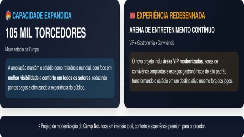 O novo Camp Nou terá capacidade aproximada para 105 mil torcedores, mantendo-se como o maior estádio da Europa. A ampliação busca melhorar a visibilidade e o conforto em todos os setores. Veja os detalhes: