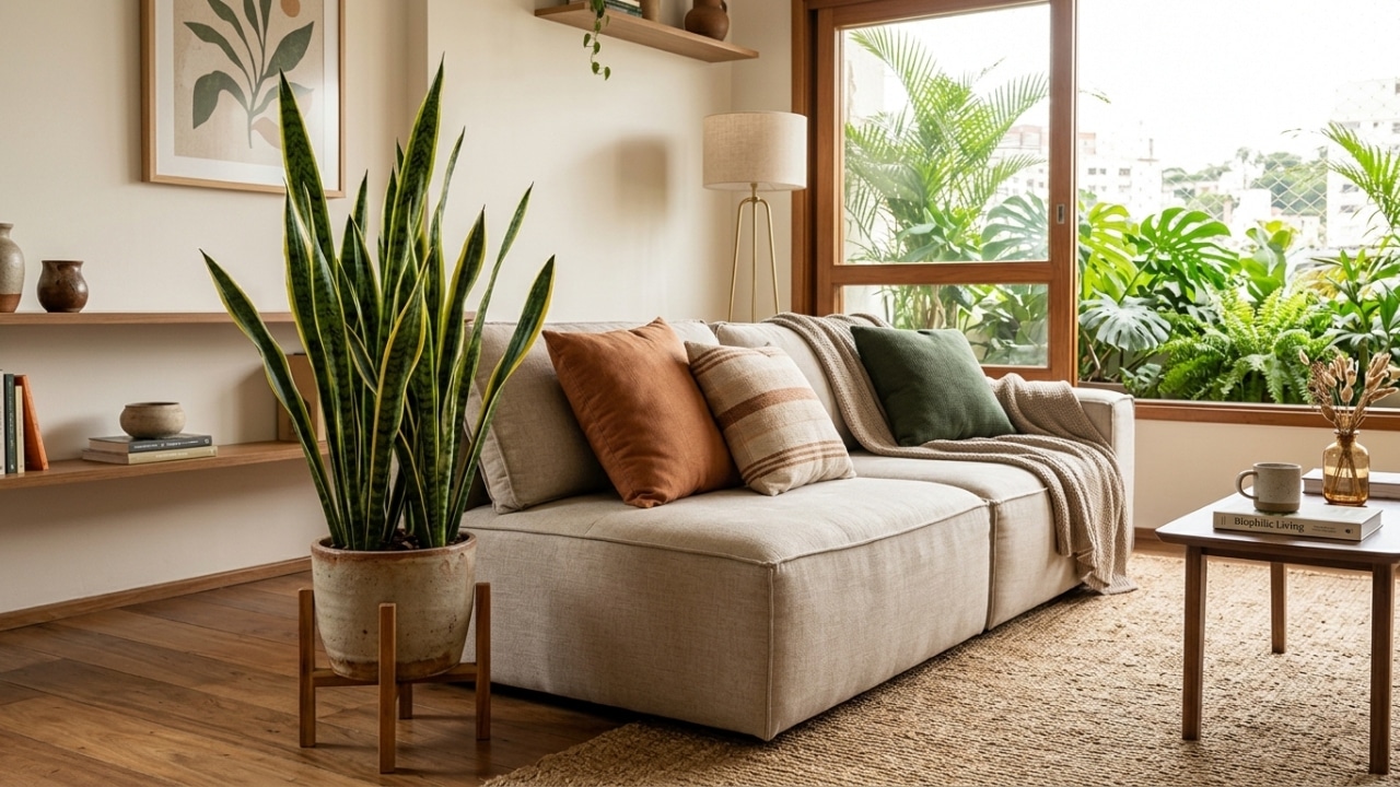 Colocar a Espada de São Jorge ao lado do sofá não é apenas uma escolha estética. No contexto do design de interiores e do bem-estar ambiental, ela ajuda a criar uma sensação de frescor visual e equilíbrio no espaço de descanso.