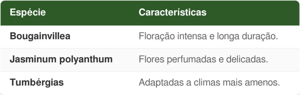 A escolha da trepadeira ideal depende do estilo do jardim e do efeito desejado. A combinação entre Bougainvillea (Primavera), Jasminum polyanthum e Lonicera japonica cria um equilíbrio entre cor, perfume e volume vegetal. Enquanto a primavera traz impacto visual, o jasmim oferece delicadeza e a madressilva garante cobertura verde contínua, mesmo em temperaturas mais baixas.