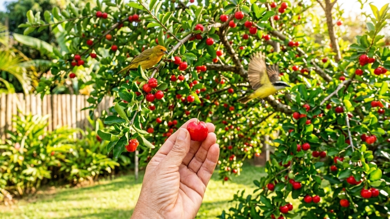 A acerola é a frutífera que qualquer quintal merece, fácil de cultivar, cheia de vitamina C e ainda atrai pássaros, unindo beleza, produção de alimentos e vida ao seu espaço externo.