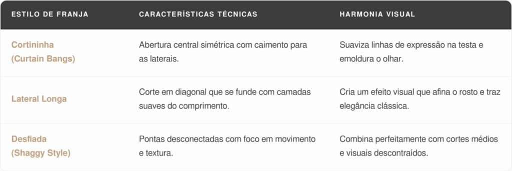 Franja para rejuvenescer aos 40 anos transforma um corte simples em protagonista, suavizando linhas na testa. Franja certa em cabelo fino chama atenção para os olhos e cria sensação de volume frontal.