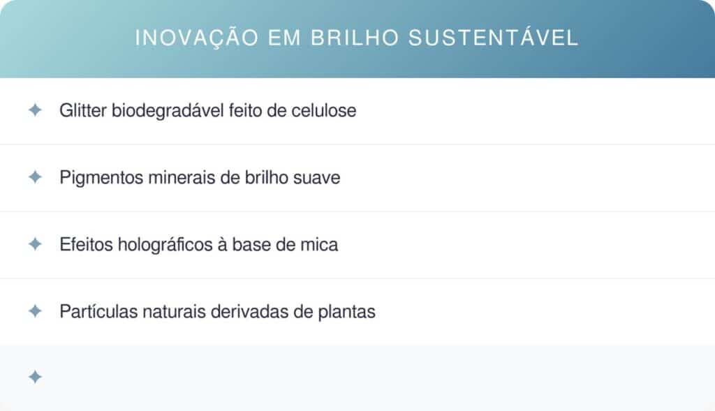 A indústria de cosméticos já vem desenvolvendo alternativas ao glitter plástico tradicional, buscando manter o efeito visual sem comprometer o meio ambiente. Essas soluções incluem materiais biodegradáveis, minerais naturais e pigmentos que oferecem brilho sem gerar microresíduos.