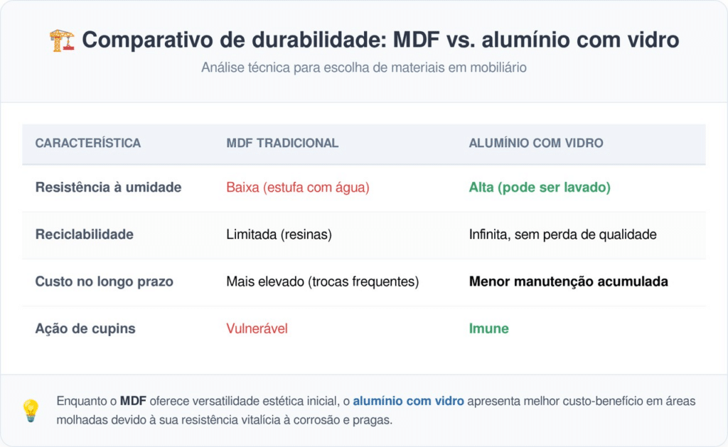 O custo de aquisição de móveis em alumínio e vidro costuma ser entre 30% e 50% superior ao do MDF de alta qualidade. No entanto, quando se leva em conta o ciclo de vida do produto, a conta tende a se inverter: a maior durabilidade reduz a necessidade de substituições e manutenções frequentes, tornando a solução mais econômica no longo prazo.
