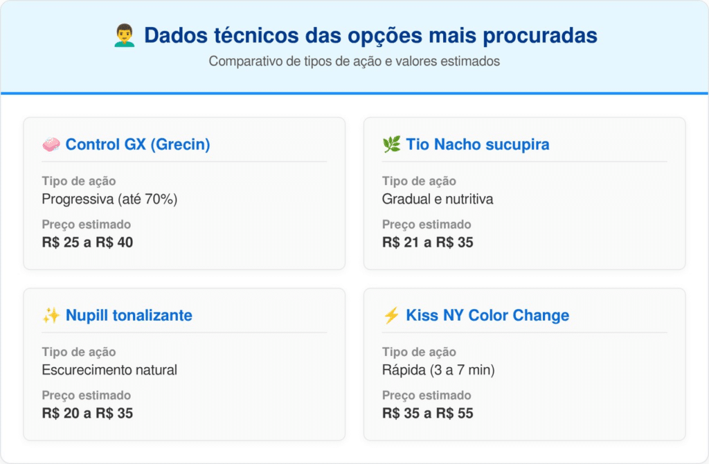 Marcas consagradas como Grecin e Tio Nacho lideram o mercado de entrada com produtos que prometem resultados graduais. O Control GX, por exemplo, é um dos favoritos por permitir que o usuário controle a intensidade do escurecimento conforme a frequência de uso nas semanas de aplicação.