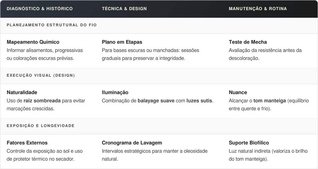 Para alinhar expectativas, é importante conversar com o profissional e explicar que deseja um loiro de baixa manutenção, com raiz esfumada e mechas sutis. Levar fotos em luz natural ajuda a mostrar o tom desejado.