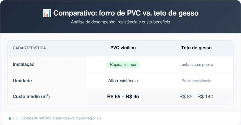 O PVC vinílico de alta densidade é uma evolução estética do plástico comum, apresentando superfícies foscas que se adequam a projetos modernos. Já o teto de gesso, embora tradicional, demanda um processo trabalhoso e é vulnerável a infiltrações que causam manchas.