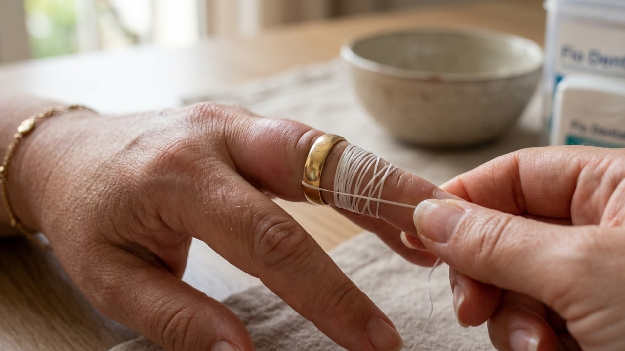 A técnica funciona com um material simples e fino, como linha, fio resistente, barbante delgado ou fio dental. O objetivo é usar esse material para comprimir o dedo de forma temporária e criar espaço para que o anel deslize com mais facilidade.
