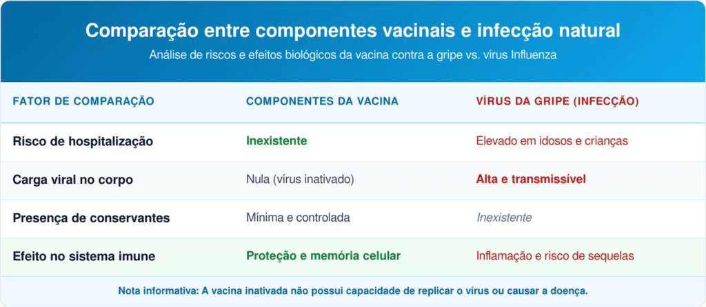 Conforme dados do portal oficial da Anvisa, a vigilância pós-comercialização é rigorosa e transparente. Veja na tabela abaixo a comparação entre os riscos de componentes residuais e os riscos da infecção natural pelo vírus influenza: