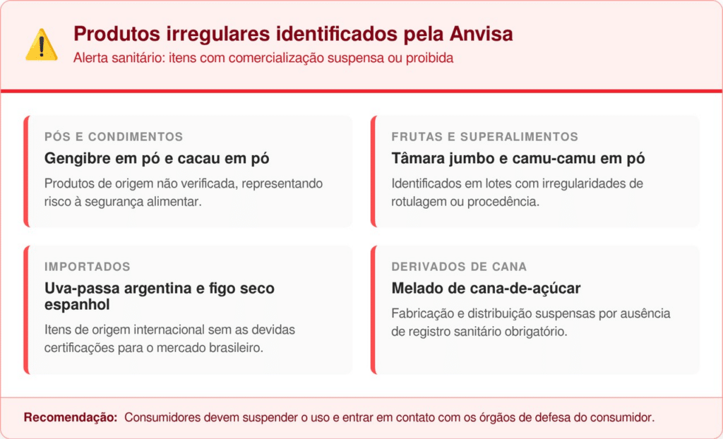 A fabricação desses alimentos sem aval técnico coloca a saúde pública em risco, pois não há garantia de higiene ou procedência. Abaixo estão os produtos irregulares identificados pela Anvisa: