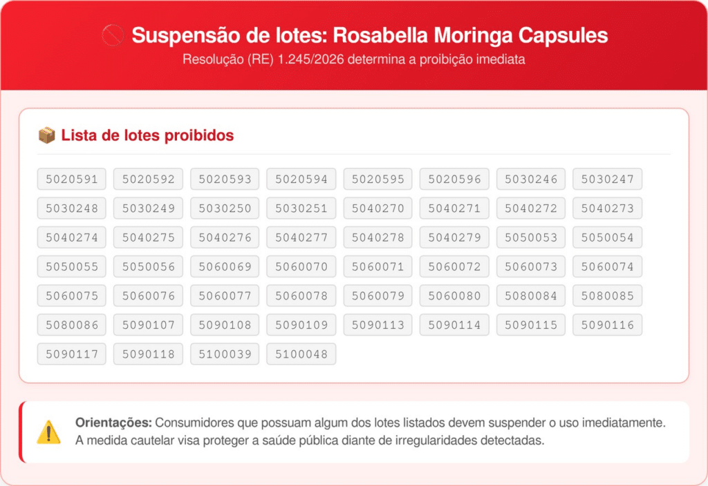 A Anvisa determinou a proibição total de comercialização e uso do suplemento alimentar Rosabella Moringa Capsules no Brasil. A medida preventiva responde a um surto internacional de Salmonella resistente a antibióticos identificado em solo americano.