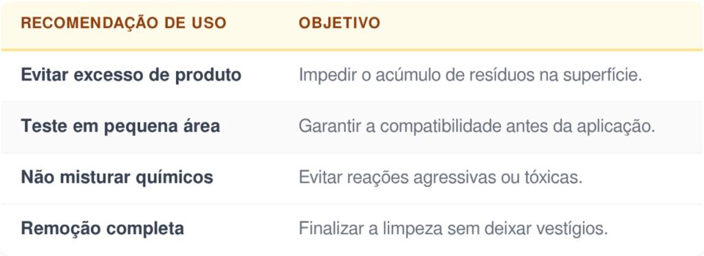 Apesar de seguro, o bicarbonato de sódio exige alguns cuidados, como usar quantidade moderada para evitar resíduos e necessidade de mais enxágue. Também é importante fazer um teste prévio em superfícies sensíveis, prevenindo alterações na textura ou no brilho.