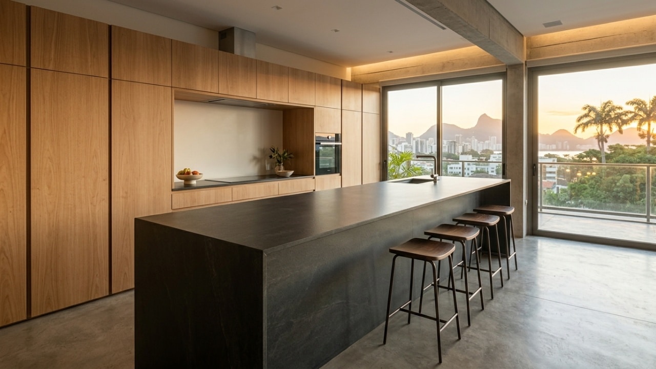 O toque sensorial é um diferencial nos novos projetos. Materiais como o MDF liso com tecnologia antidigital e pedras sinterizadas de ultracompactação são os favoritos. Eles oferecem durabilidade extrema e uma estética monolítica, essencial para manter o conceito de blocos de cor única na decoração.