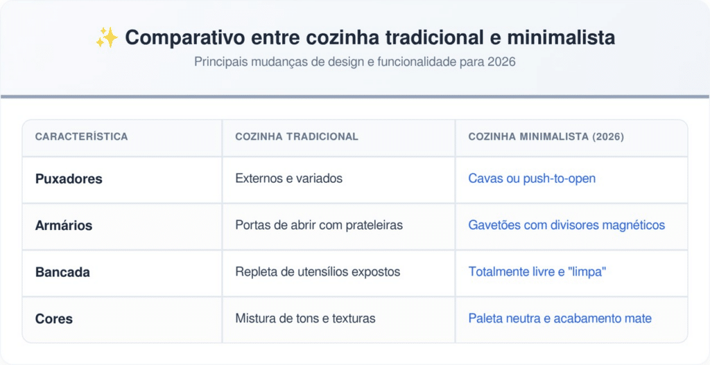Abaixo, organizamos uma tabela comparativa entre a cozinha tradicional e a nova proposta minimalista para ajudar no seu planejamento: