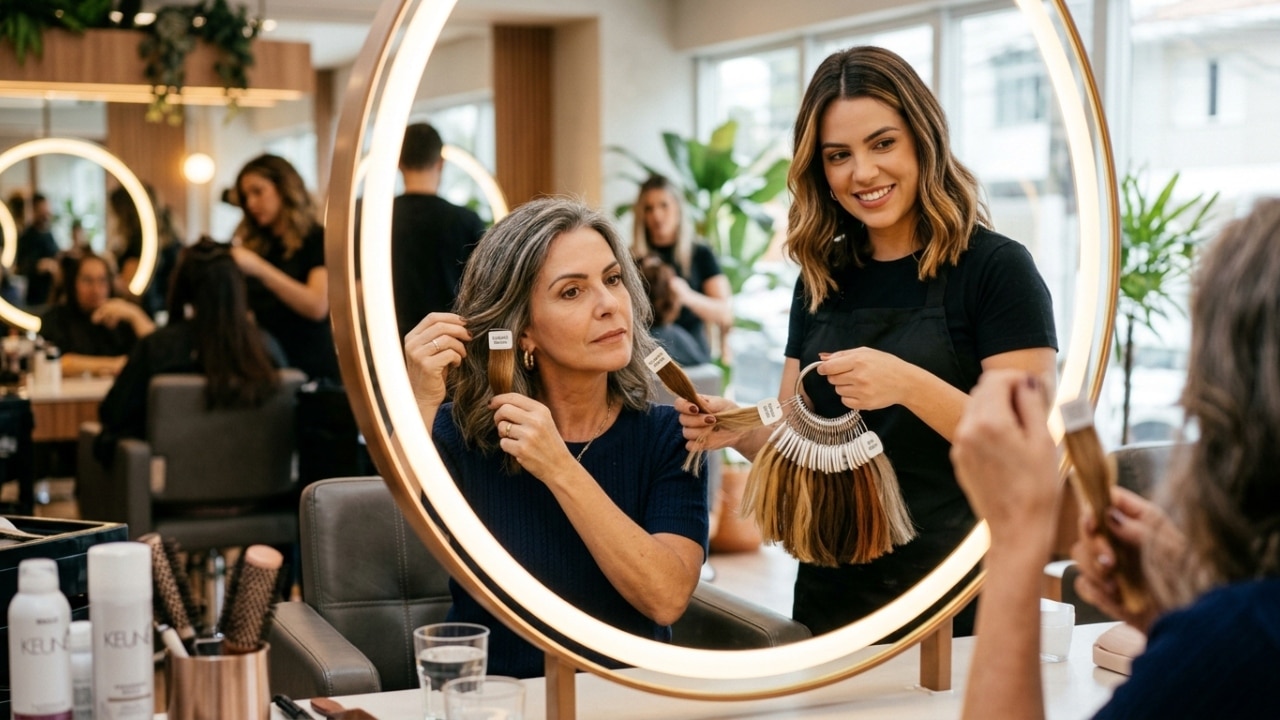 A cor dos fios influencia diretamente na forma como a pele é percebida, podendo suavizar linhas de expressão e trazer frescor ao visual. Por isso, colorações que se aproximam do tom natural, com toques de luz bem distribuídos, costumam ser as mais indicadas após os 50.