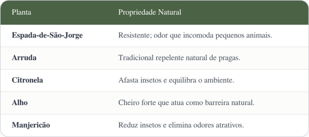 Listamos abaixo as principais plantas utilizadas para esse fim e suas respetivas propriedades, que funcionam como barreiras sensoriais capazes de afastar pequenos animais e insetos através de odores e substâncias repelentes: