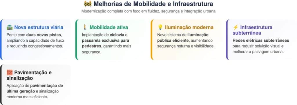O projeto de modernização prevê uma transformação completa na mobilidade local, com foco em integração urbana e fluidez no tráfego da região.A ponte contará com duas novas pistas, além de uma ciclovia e uma passarela exclusiva para pedestres. Também estão previstas melhorias estéticas e funcionais significativas. Entre os destaques do projeto estão: