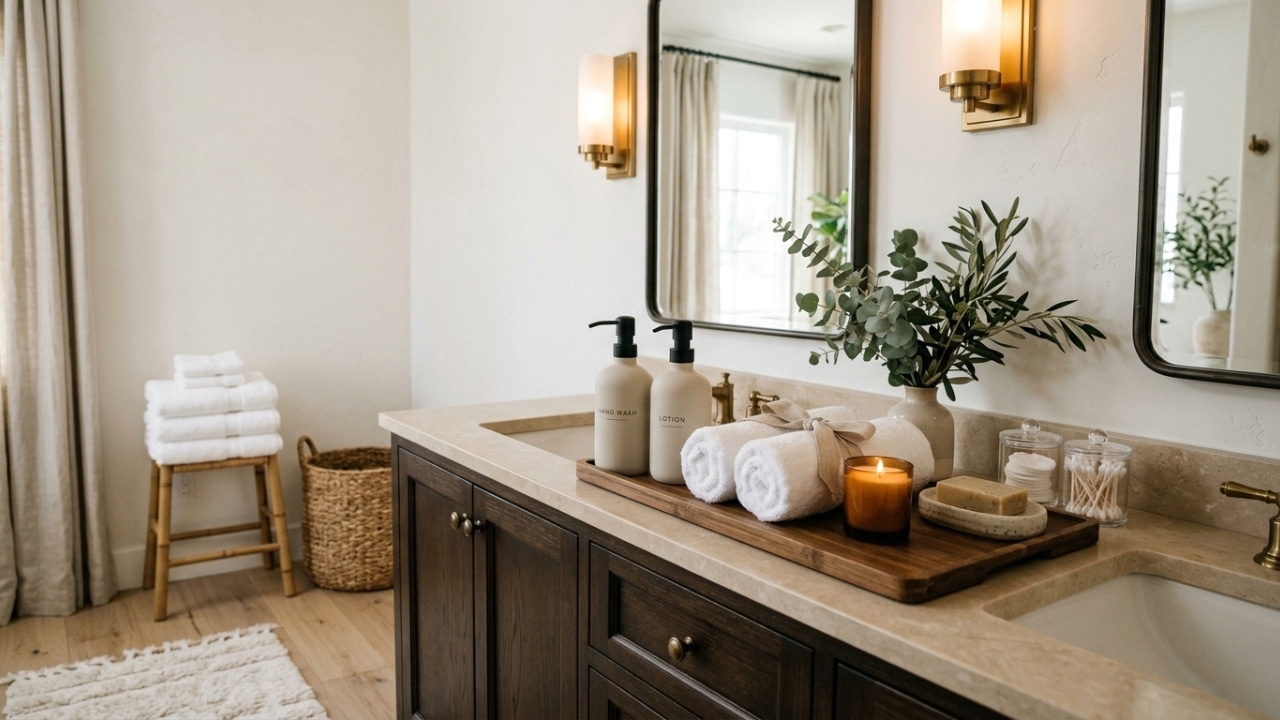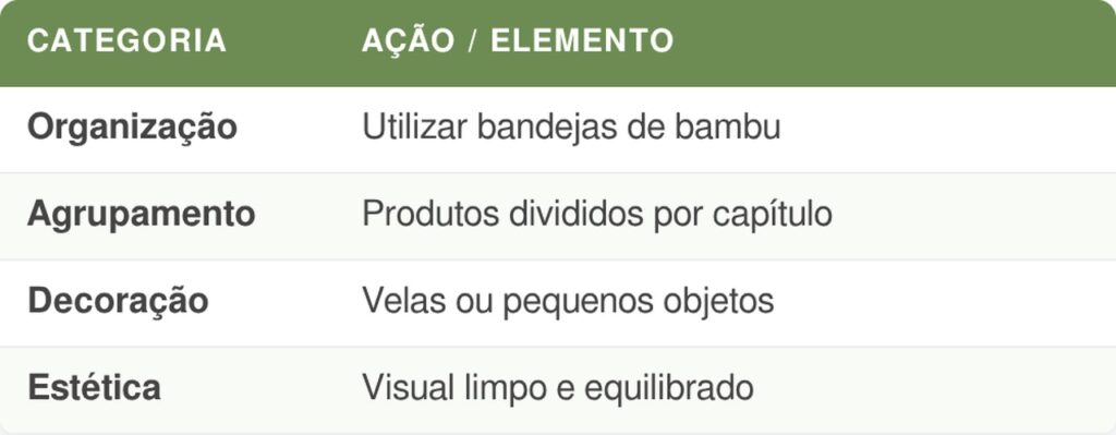A escolha de acessórios em materiais naturais, como bambu e madeira, cria um efeito de spa ao trazer aconchego e quebrar a frieza do ambiente. O uso de bandejas para organizar e agrupar objetos com intenção estética elimina a desordem, promovendo uma experiência sensorial de luxo e cuidado.