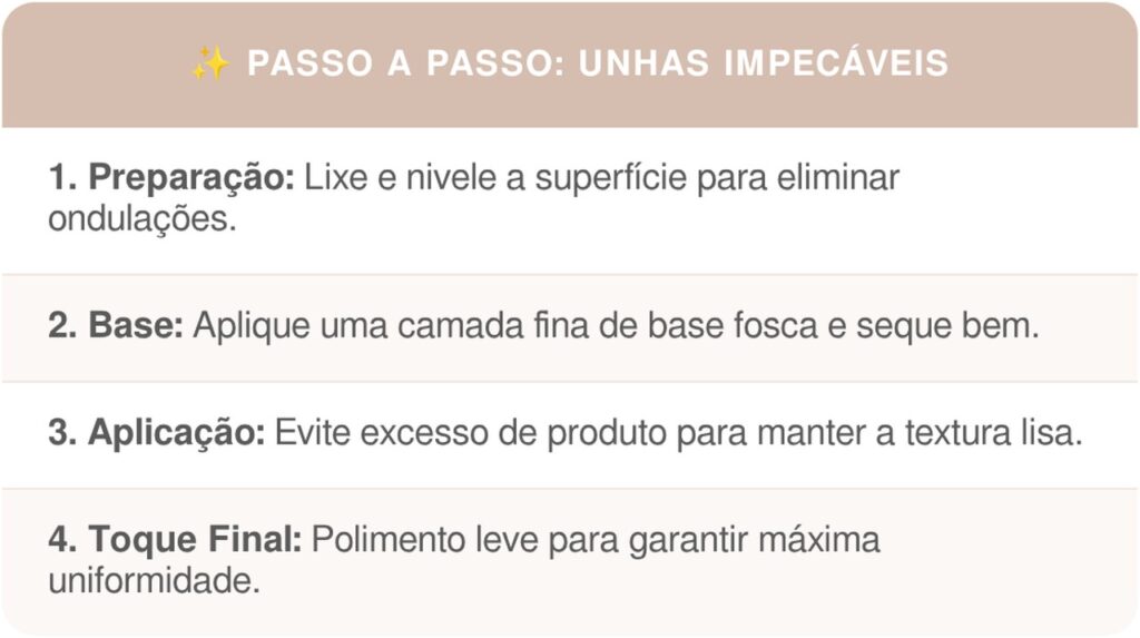 Esmaltes nude possuem menor concentração de pigmento, o que exige técnica de aplicação mais precisa. Sem uma boa base niveladora, qualquer irregularidade da unha natural aparece, prejudicando o acabamento.