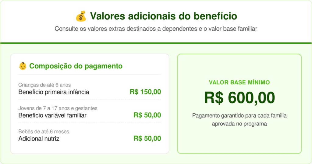 O valor extra de R$ 150 é destinado especificamente às famílias que possuem crianças de 0 a 6 anos incompletos. Este montante, chamado de Benefício Primeira Infância, visa garantir segurança alimentar e suporte no desenvolvimento infantil durante a fase mais crítica do crescimento.