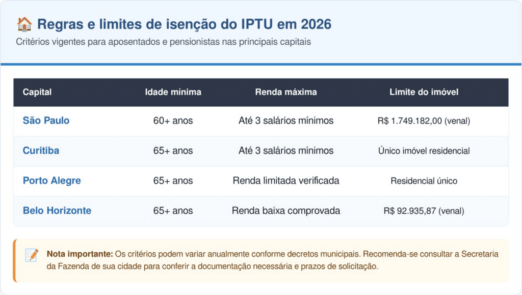 A isenção de IPTU para idosos em 2026 não é uma regra nacional, mas sim um benefício concedido por diversas prefeituras brasileiras. O direito varia conforme a legislação de cada município, exigindo que o cidadão fique atento aos prazos e requisitos específicos de sua cidade.
