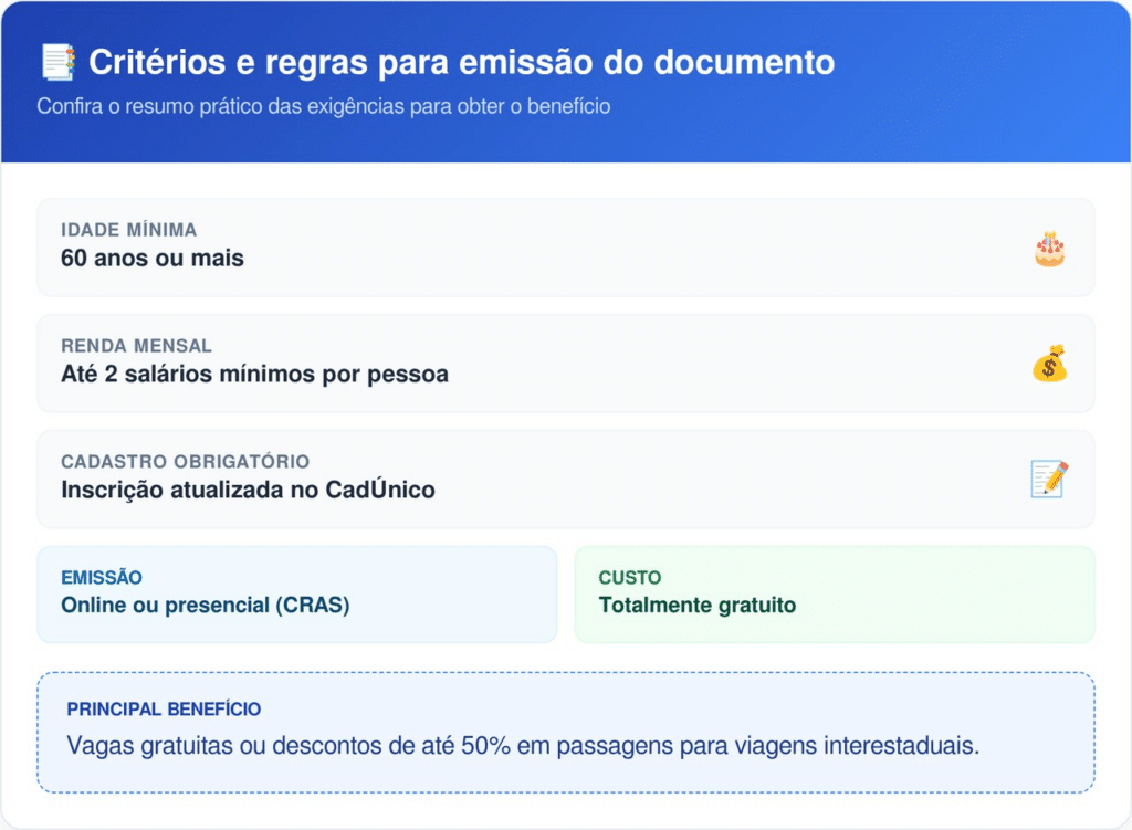 A Carteira da Pessoa Idosa garante acesso a passagens gratuitas ou com desconto em viagens interestaduais para brasileiros com 60 anos ou mais e renda individual de até dois salários mínimos. Para conseguir o documento, é obrigatório ter cadastro atualizado no Cadastro Único, já que é por meio dele que o governo valida as informações. A emissão pode ser feita online pelo Ministério do Desenvolvimento e Assistência Social ou presencialmente no CRAS, sem custo.