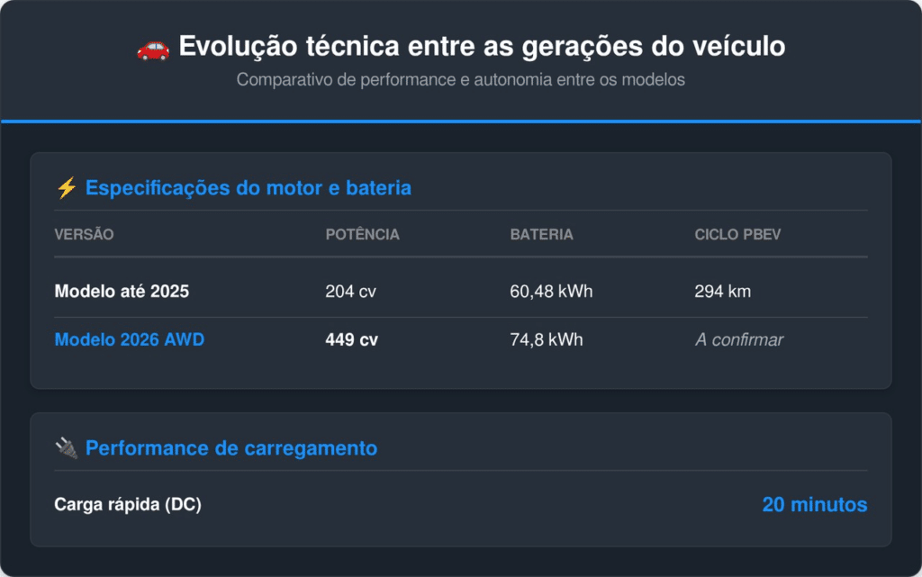 Para a nova versão de 2026, a bateria de 74,8 kWh promete maior fôlego em trajetos rodoviários. A eficiência energética é monitorada constantemente pelo Inmetro, que fornece a etiqueta de consumo necessária para a comparação entre modelos concorrentes.