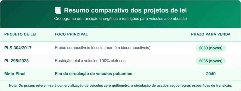 É importante destacar que a lei não confiscará veículos que já estão nas ruas. As restrições iniciais focam na venda de unidades 0 km, permitindo que a frota antiga continue circulando por um período de transição, embora o PLS 304/2017 preveja o fim da circulação a combustão em 2040.