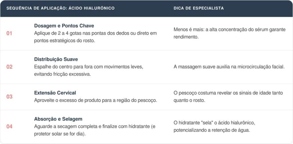 Aplicar ácido hialurônico passo a passo aumenta a eficiência do produto e reduz o risco de incômodo em peles sensíveis. Usar a quantidade certa e espalhar de forma uniforme ajuda na absorção.