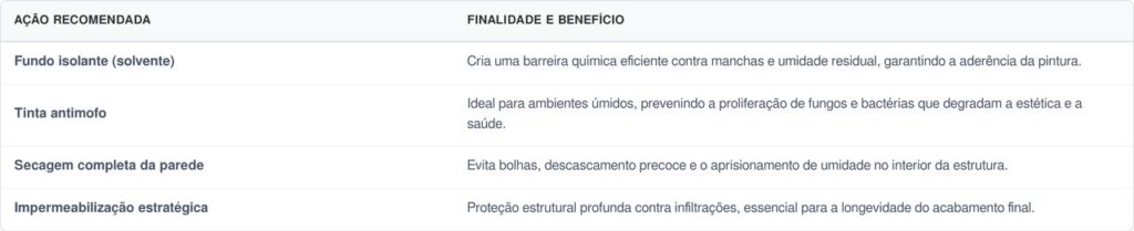 Após a preparação, é fundamental aplicar um bloqueador de manchas ou fundo isolante. Esse produto impede que a umidade e resíduos antigos atravessem a nova pintura.