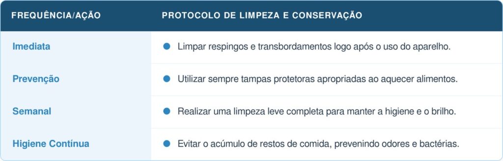 Manter a limpeza regular é essencial para evitar o acúmulo de resíduos e odores no micro-ondas. Pequenos hábitos de higiene fazem diferença na conservação do eletrodoméstico.
