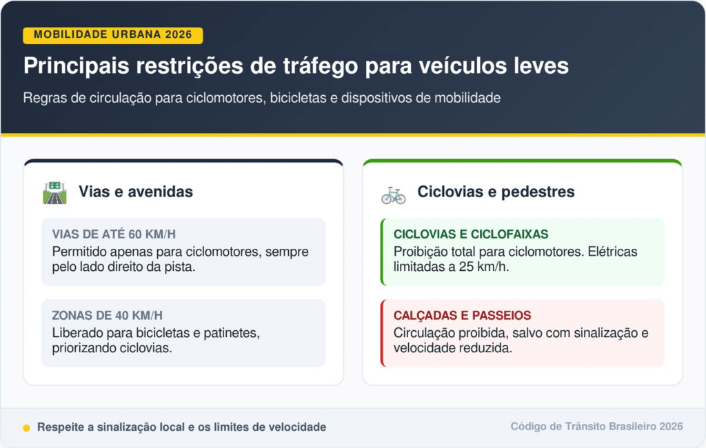 As regras de circulação dependem diretamente da velocidade máxima permitida na via urbana. Em ruas com limite acima de 60 km/h, a presença desses veículos é proibida, o que restringe o acesso a diversas áreas litorâneas do Rio de Janeiro.